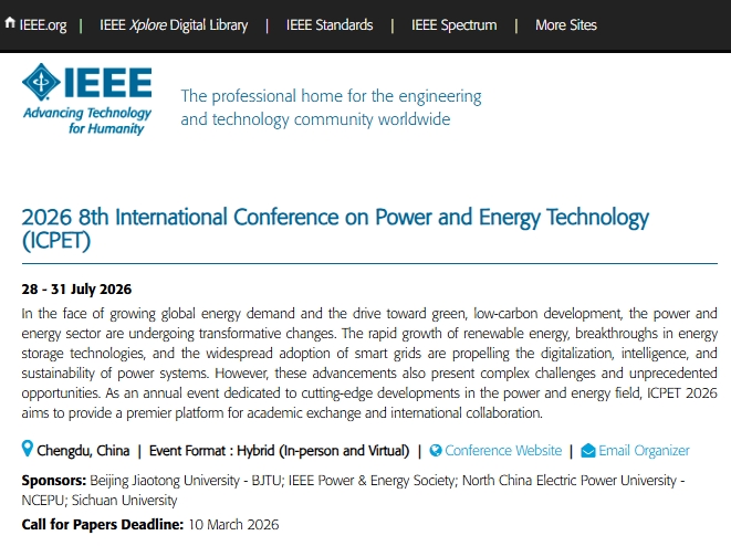 2026 the 8th International Conference on Power and Energy Technology (ICPET) will be held in Chengdu, Sichuan, China during July 28-31, 2026. The conference is sponsored by Sichuan University, PES, IEEE, co-sponsored by Beijing Jiaotong University, and North China Electric Power University, hosted by College of Electrical Engineering, Sichuan University, co-hosted by School of Electronic Engineering, Beijing Jiaotong University, School of Electrical and Electronic Engineering, North China Electric Power University, Energy Storage and Electrotechnics Department in China Electric Power Research Institute, patrons with Tianjin University, Southeast University, Lanzhou Jiaotong University, media supports from Proceedings of the CSEE, Journal of Automation of Electric Power Systems, Journal of Modern Power Systems and Clean Energy, Journal of Power System Technology, Journal of High Voltage Engineering, Journal of Electric Power Information and Communication Technology, CESS Journal of Power and Energy Systems, Journal of High Voltage, Journal of Energy Internet, Journal of Cyber-Physical Energy Systems, Journal of Energy Conversion and Economics, Journal of Electric Power Automation Equipment, Journal of Electric Power Construction, Journal of Electric Power, Shandong Electric Power.